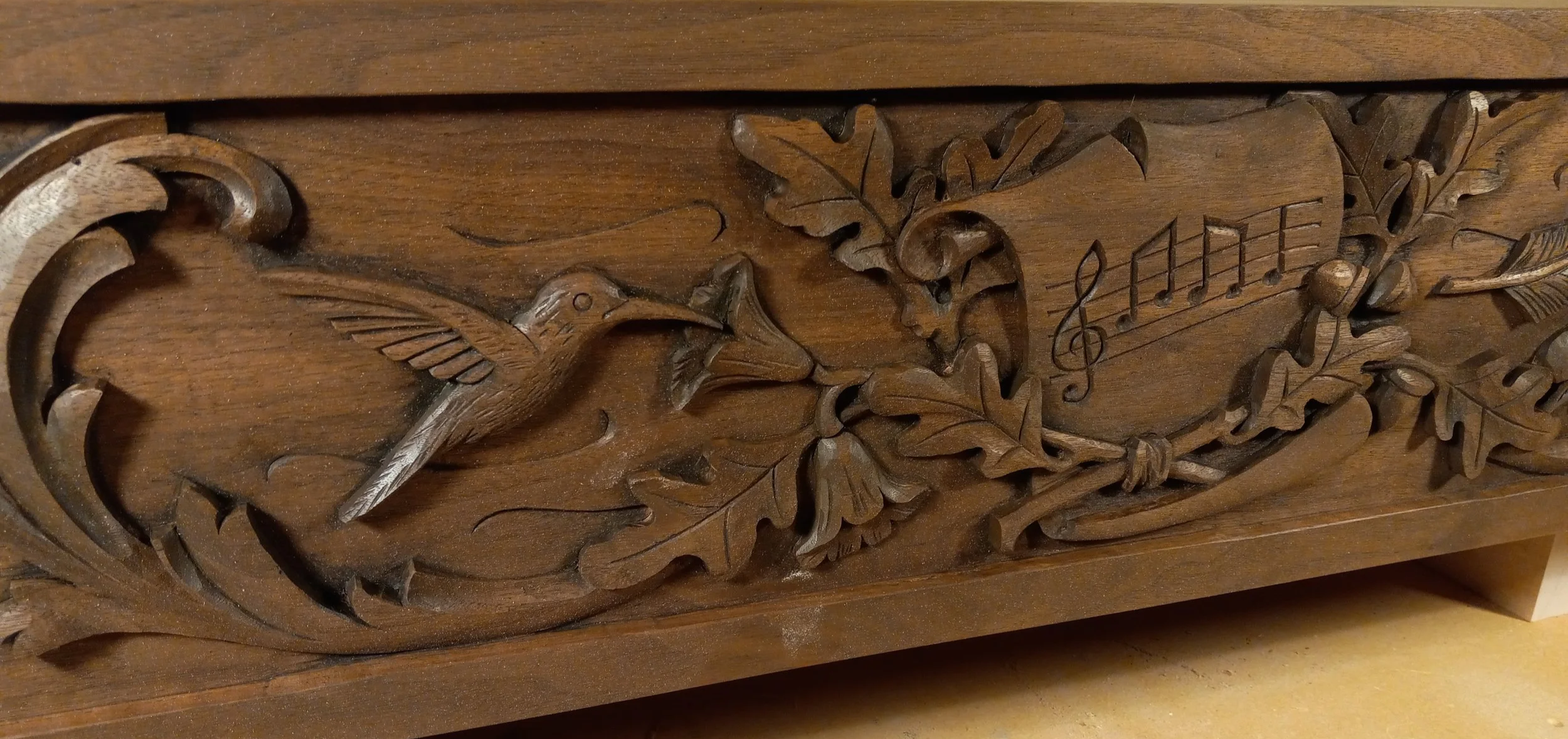 Detail of the hand carved mantel featuring violets.